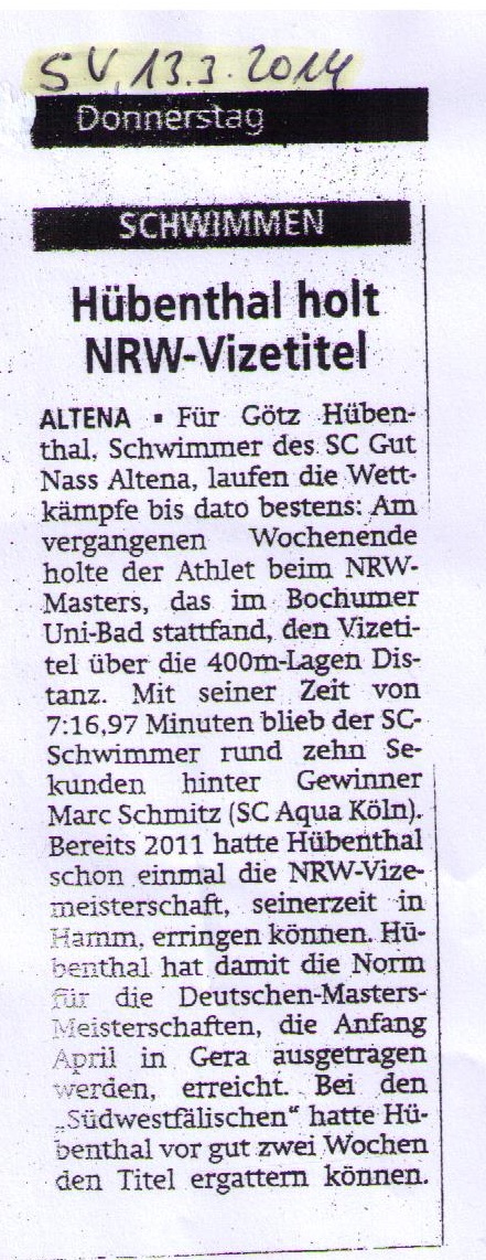 In dieser Kategorie veröffentlichen wir in regelmäßigen Abständen Presseveröffentlichungen rund um den Schwimmverein SC Gut Nass Altena e.V.